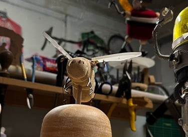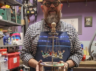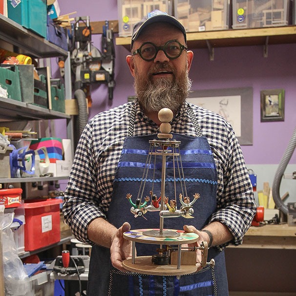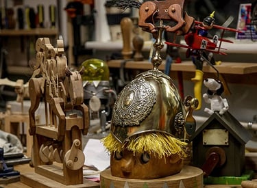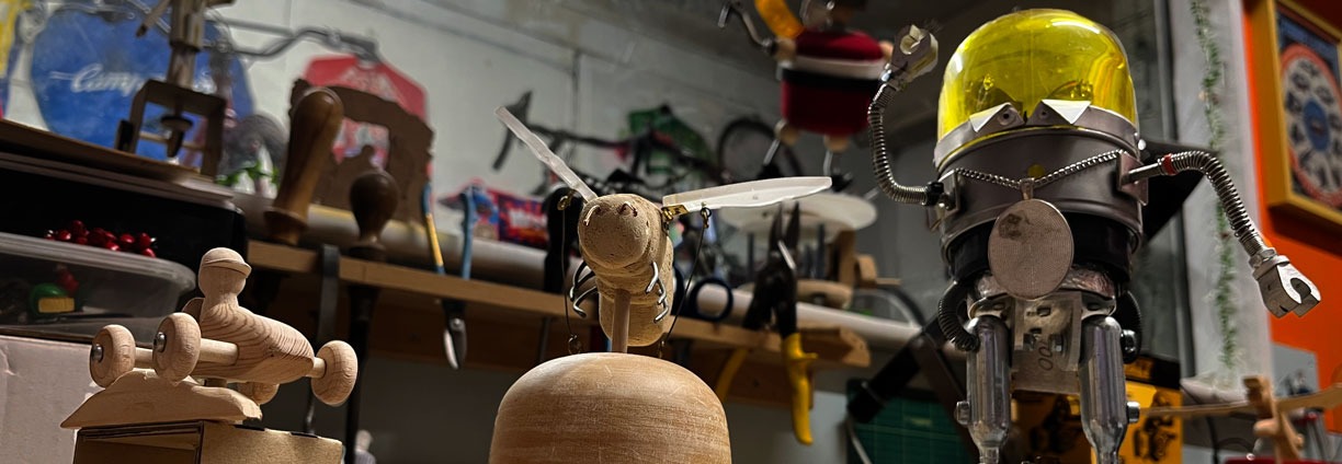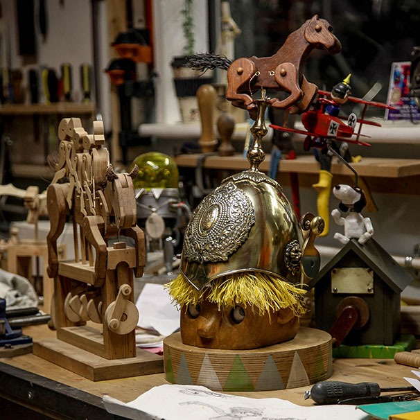 At Cranky Bear Automata, Roger Whiter creates unique hand-cranked mechanical toys from wood, metal, and upcycled materials in his workshop situated in Southville, Bristol's south-of-the-river creative hub, home to the Tobacco Factory theatre and the Upfest graffiti festival.